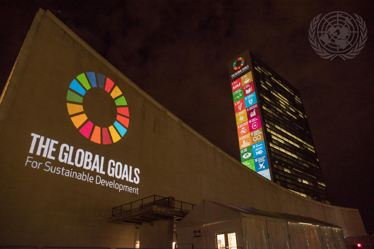The Sustainable Development Goals projected onto the United Nations Headquarters in New York City. Photo: UN Photo/Cia Pak.